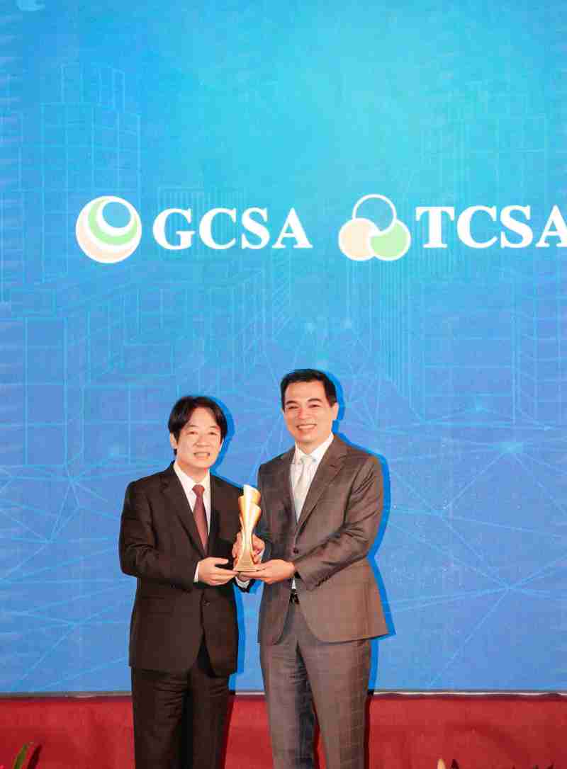 达全方位永续表现获全球永续奖及台湾永续奖肯定,,,,由副总统赖清德颁奖 (左),,z6mg·人生就是博总经理柯富仁 (右) 代表领奖