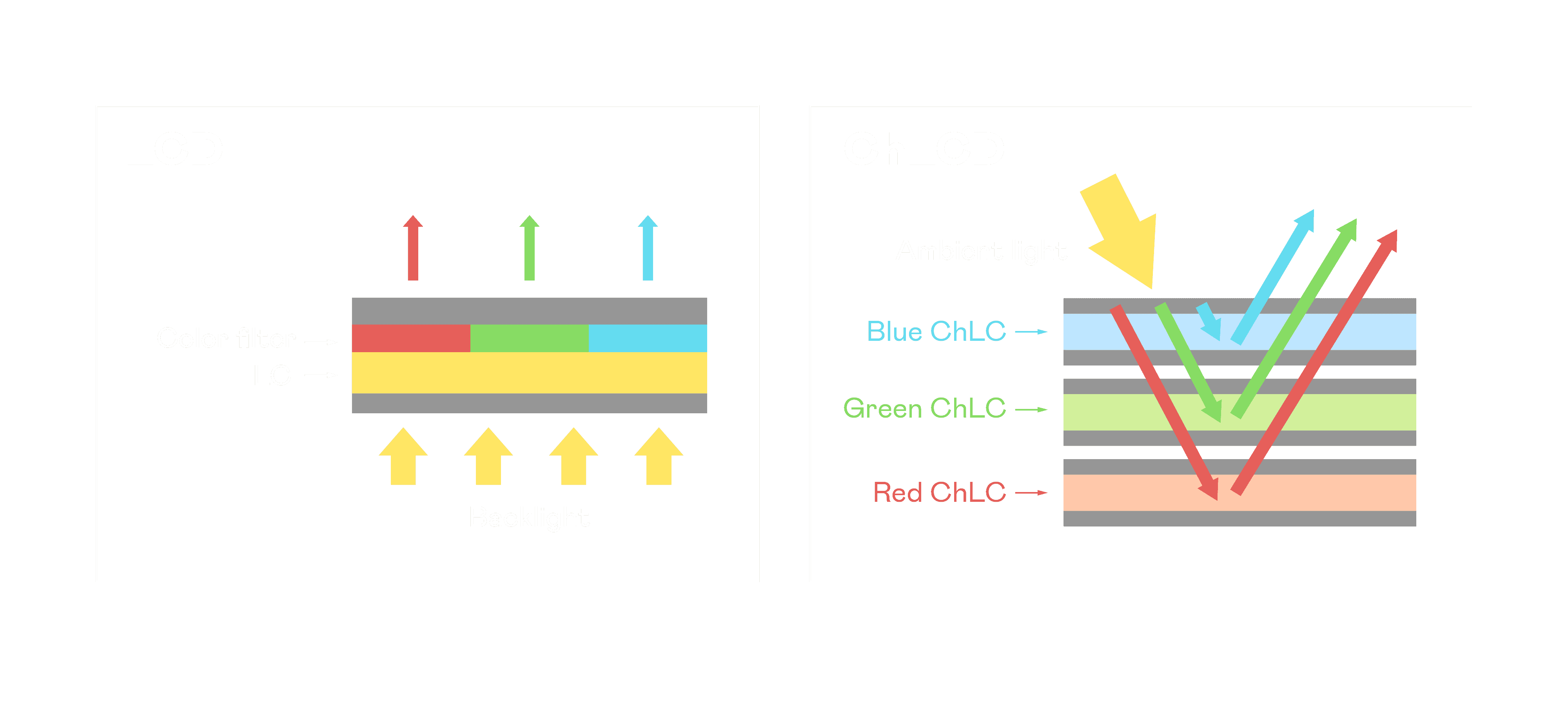 ChLCD 胆固醇液晶就如同纸张一样,,透过反射环境光来显示影像,,因此长时间观看不易造成人眼视觉疲劳,,,,可达到护眼效果。。当处于户外阳光下使用,,LCD 影像容易失真而不易观看,,,,但胆固醇液晶仍可维持较佳的影像品质。。