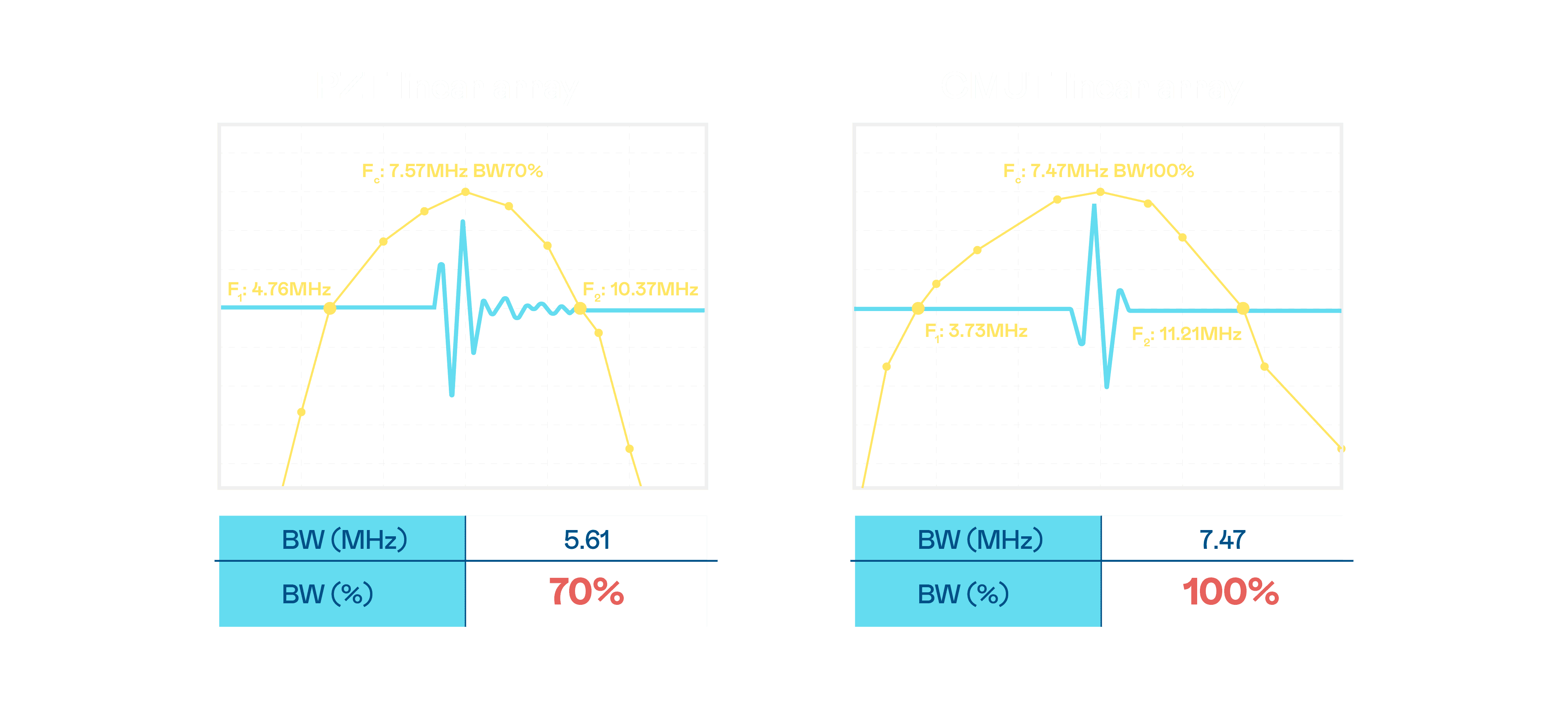 超音波影像的解析度高低,,首先取决于探头能发出的讯号频宽。。。。z6mg·人生就是博 CMUT 可提供高清晰的超音波讯号,,提供高频宽、、、、高灵敏度、、、影像纹理细节更高的超音波影像,,,,协助医护人员缩短影像判读时间及利用精准的医疗影像进行诊断。。。。